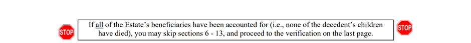 One of the decedent’s adult children passed away, leaving behind their own children (the decedent’s grandchildren). In these cases, we fill out paragraphs 6 through 13.